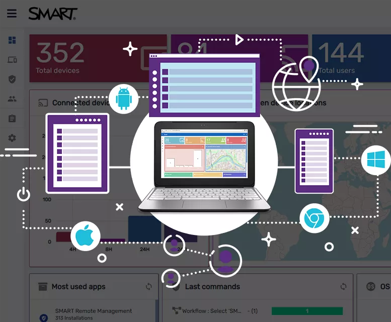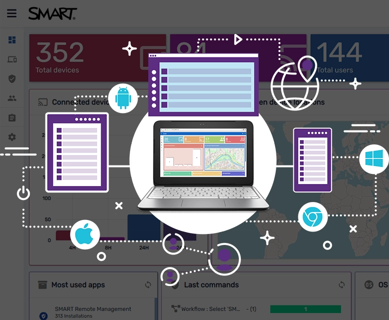 SMART Remote Management- хмарний інструмент керування пристроями, який можна використовувати для віддаленого обслуговування, підтримки, контролю та захисту інтерактивних дисплеїв SMART Board і пристроїв Android , iOS, macOS, Windows і Chrome OS у вашій організації.