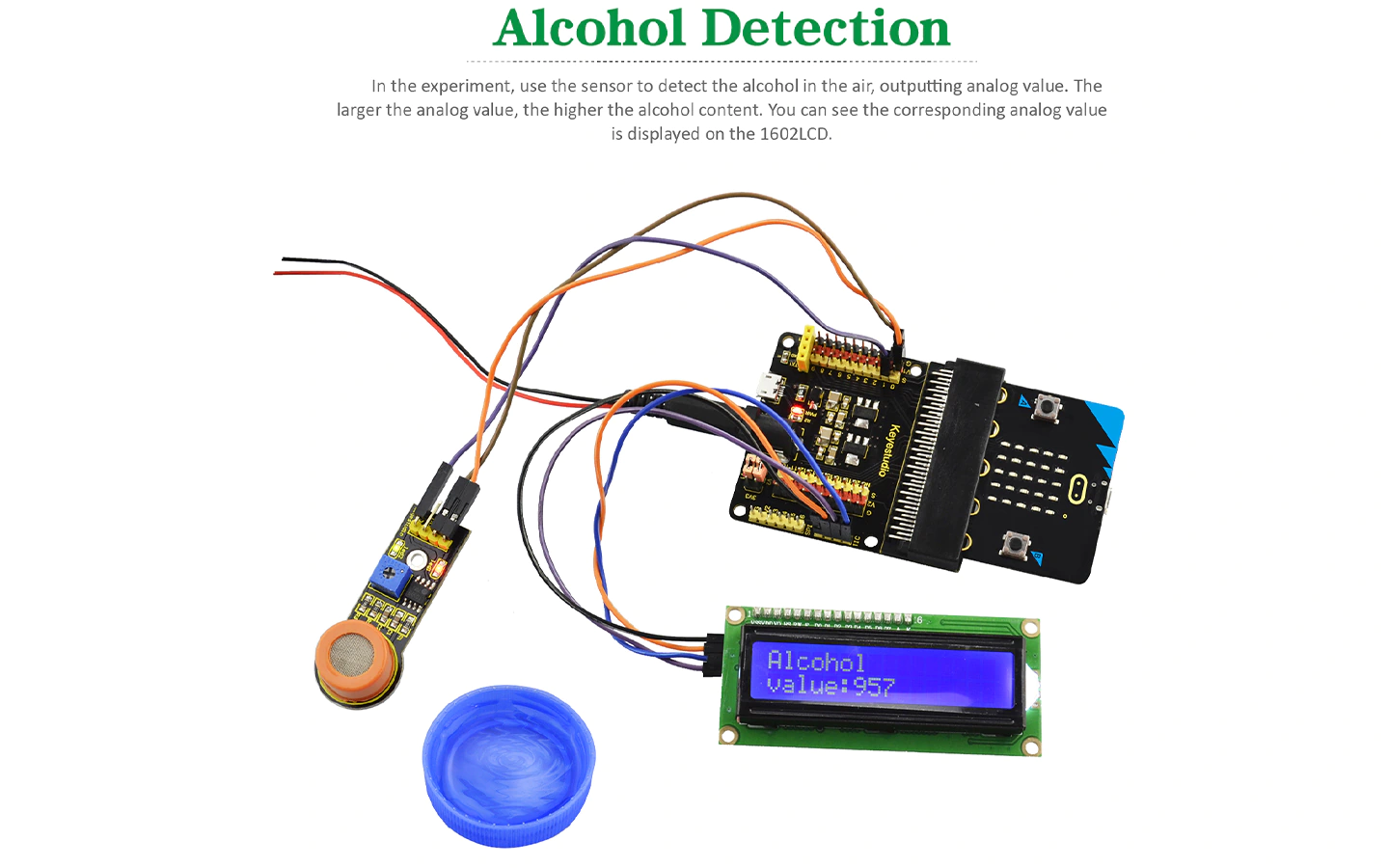 У цьому експерименті датчик визначає концентрацію парів алкоголю у повітрі, показання якого зчитує контролер та відображає на дисплеї. Датчик має аналоговий вихід, напруга на якому контролер переводить значення концентрації. |