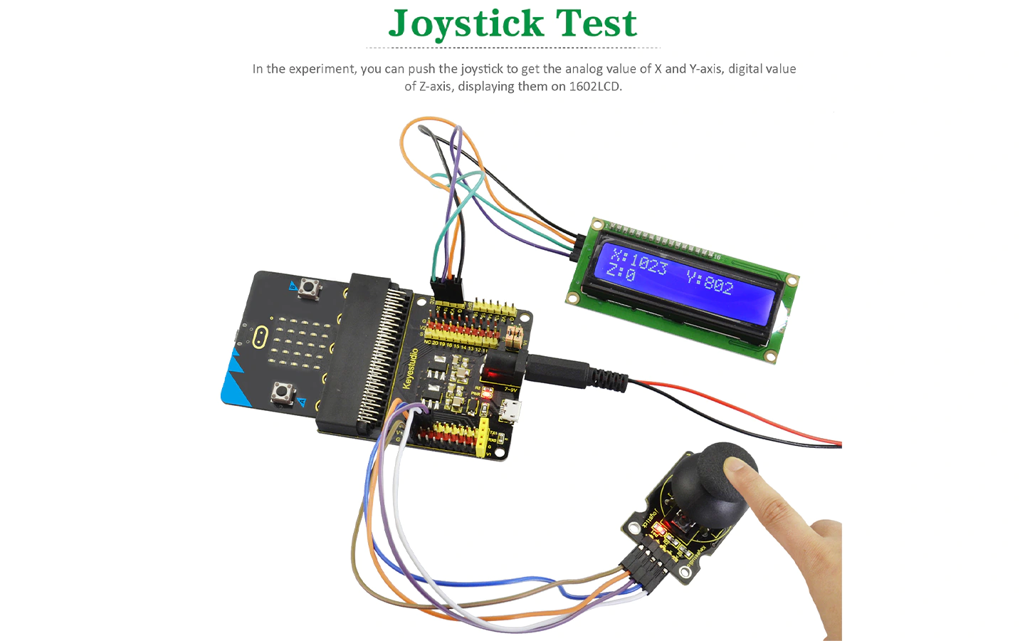 У цьому експерименті контролер зчитує значення напруги, що видаються резисторами джойстика та відображає їх на LCD дисплеї. Експеримент дозволяє зрозуміти принцип роботи джойстика та межі зміни його вихідної напруги від кута нахилу ручки джойстика. |