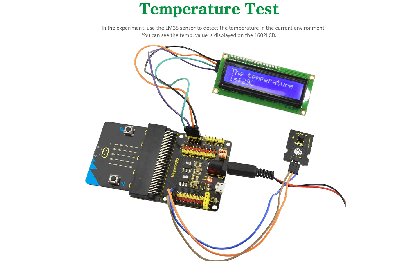 Контролер, використовуючи модуль датчика температури LM35, вимірює температуру навколишнього середовища і відображає її на LCD дисплеї. |