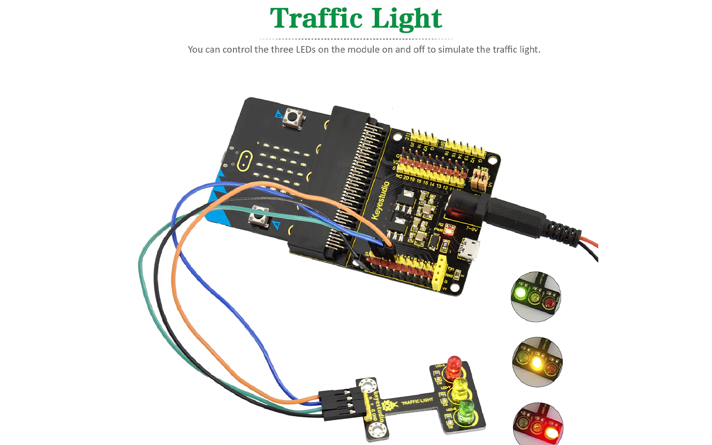 Контролер керує світлодіодами трьох кольорів – червоним, жовтим та зеленим та імітує роботу дорожнього світлофора. |