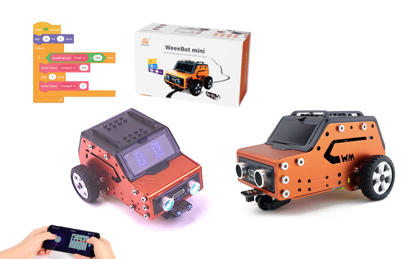 WeeeBot Mini – це економний комплект роботів STEAM початкового рівня, розроблений на платформі робочих конструкцій WeeeMake.